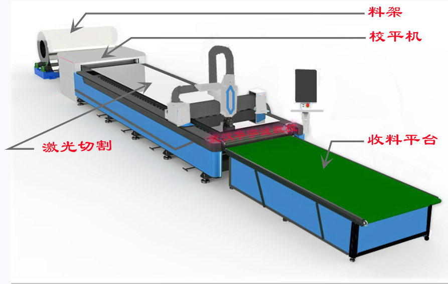 卷料備展開后,經(jīng)過了整平這一工序,材料內(nèi)應(yīng)力便得到了大部分的消除,在通過系統(tǒng)控制的激光切割頭在激光切割平臺(tái)上進(jìn)行的三維運(yùn)動(dòng)切割,實(shí)現(xiàn)對(duì)金屬帶料的自動(dòng)落料。